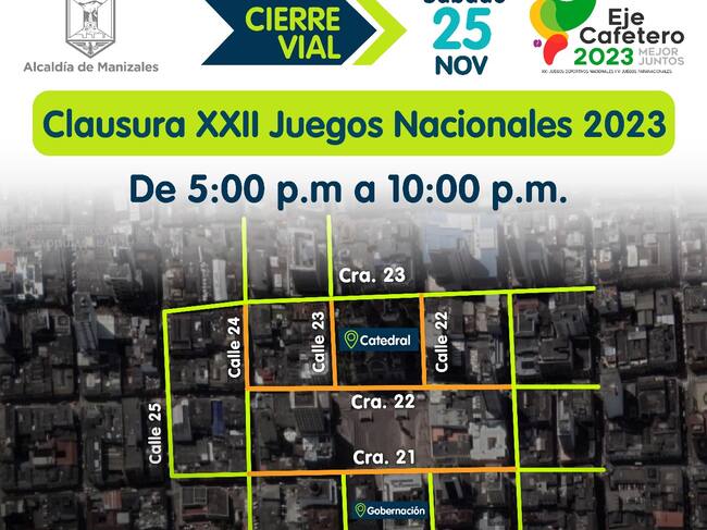 Manizales realizará la clausura de los Juegos Nacionales - Eje Cafetero 2023 este sábado desde la 6:00 p.m. Es por ello que para la realización de este evento la Secretaría de Movilidad programó varios cierres viales.