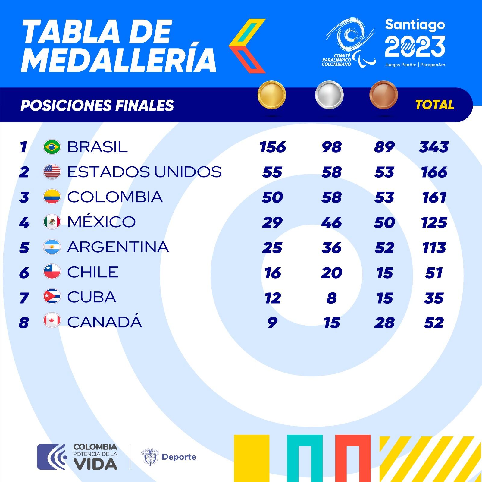 Colombia se quedó con el tercer cajón de los Juegos Paranapanamericanos Santiago 2023, ubicándose por detrás de Estados Unidos y Brasil, que dominó por quinta ocasión consecutiva el medallero general de las justas deportivas. De las 343 medallas obtenidas por la delegación brasileña, 156 fueron de oro, un abismo inmenso frente a sus rivales.