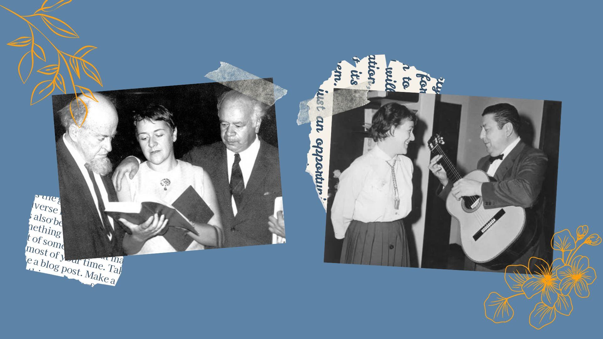 Maruja Vieira junto a León de Greiff, Eduardo Carranza y Atahualpa Yupanqui. Fotos: Archivo de Maruja Vieira y Gustavo Montes Arias.