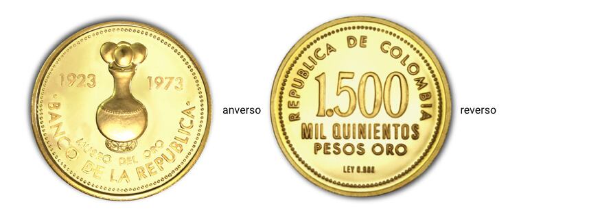 En el anverso la moneda tiene el recipiente Quimbaya (Poporo), que inició la colección del Museo del Oro en Bogotá. Por su parte, en el reverso se lee el valor de la moneda acompañado de la marca de la República de Colombia. La moneda tiene un bordeado punteado por ambas caras.