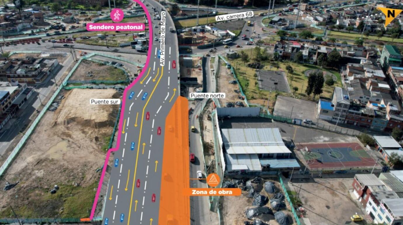 El desvío se hará por los carriles surorientales del puente vehicular de la Avenida Primero de Mayo a la altura de la Avenida 68. Este desvío permitirá adelantar obras sobre el costado nor-oriental del puente.