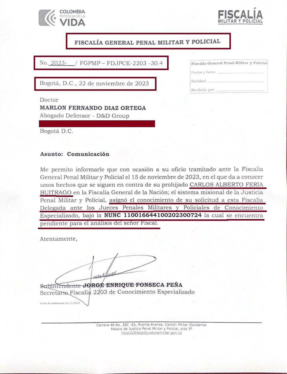 La defensa del coronel Carlos Feria, Jefe de Protección de la Presidencia de la República, elevó una solicitud a la Justicia Penal Militar y Policial para que asuma las investigaciones por la posible práctica ilegal del polígrafo a Marelbys Meza, exniñera de Laura Sarabia, directora del Departamento de Prosperidad Social (DPS).