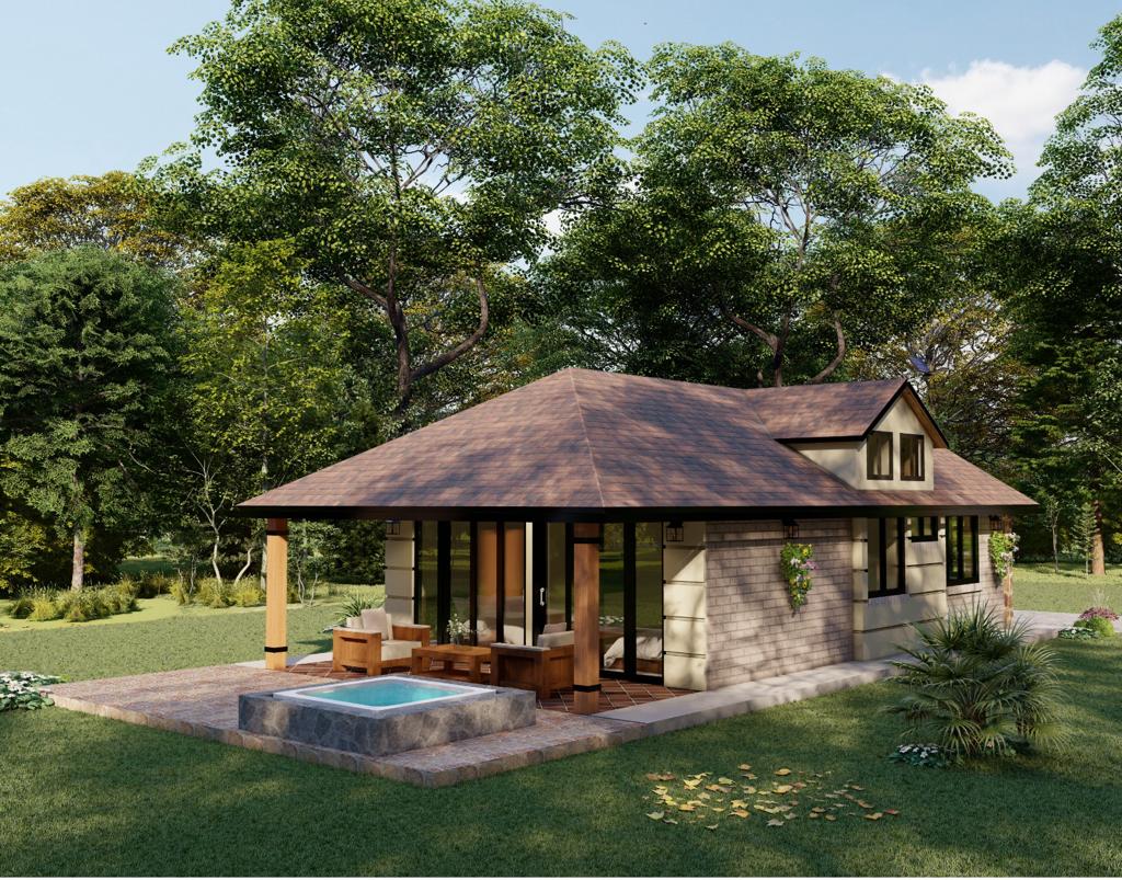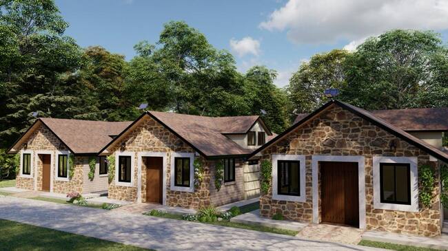 6. Excelente distribución: cada cabaña tendrá 75 m² de área construida más un parqueadero, cocina integral, barra americana, sala, zona de ropas, 1 baño, estudio, 2 alcobas y una terraza posterior orientada hacia un bosque de 20.000 m² que rodea el condominio.
