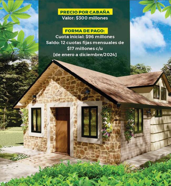 8. Facilidades de pago: el precio de cada cabaña es de $300 millones, con una cuota inicial de $96 millones y el saldo se podrá pagar en 12 cuotas fijas mensuales de $17 millones desde enero hasta diciembre del próximo año.