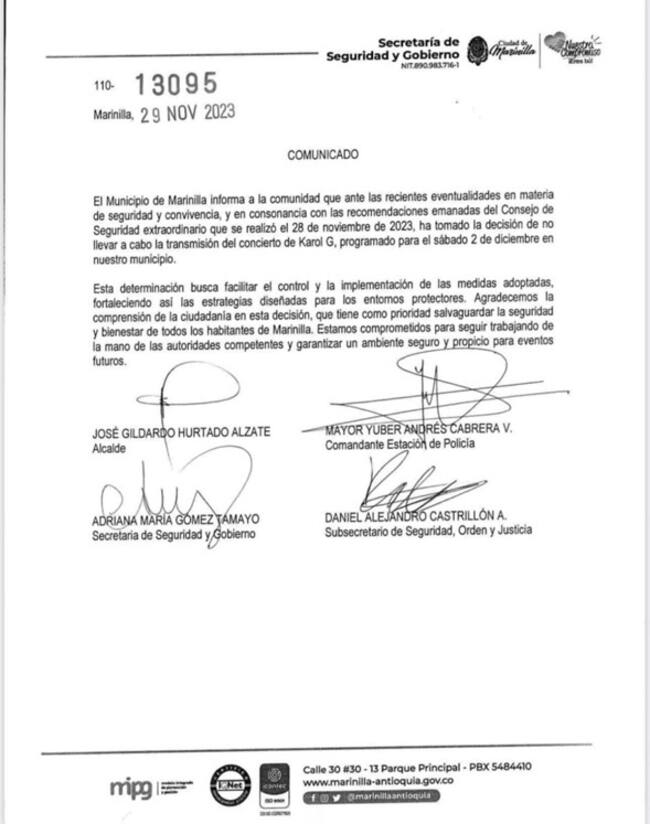 La alcaldía del municipio de Marinilla, Antioquia, anunció en un comunicado que no se hará la transmisión del concierto de Karol G por la racha de asesinatos en el casco urbano que sufre el municipio. En el comunicado la alcaldía también aseguró que no hay condiciones de seguridad para que se haga el evento y que la cancelación se da para facilitar la implementación de las medidas de seguridad.