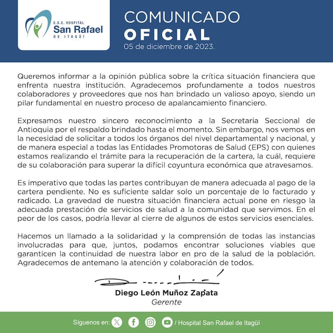 Por medio de un comunicado oficial, el hospital San Rafael de Itagüí, informó a la opinión pública su situación financiera actual, a la que declararon en crisis. En este anuncio, el hospital hizo la solicitud a los órganos departamentales, nacionales y a todas las Entidades Promotoras de Salud (EPS), en búsqueda de la recuperación de la cartera y así, contribuir a la superación de su coyuntura económica.
