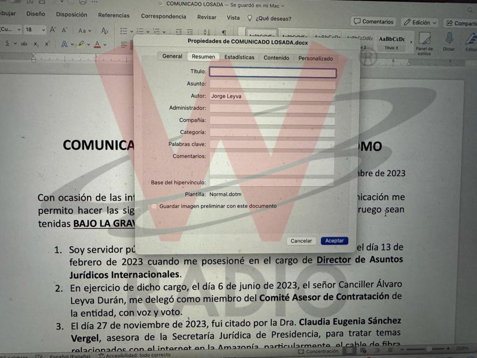 El comunicado pasaría totalmente desapercibido por su absoluta falta de importancia, salvo por un detalle: la metadata del documento electrónico muestra que no fue escrito por Juan Carlos Losada. El verdadero autor del comunicado es Jorge Leyva, el hijo del canciller Álvaro Leyva.