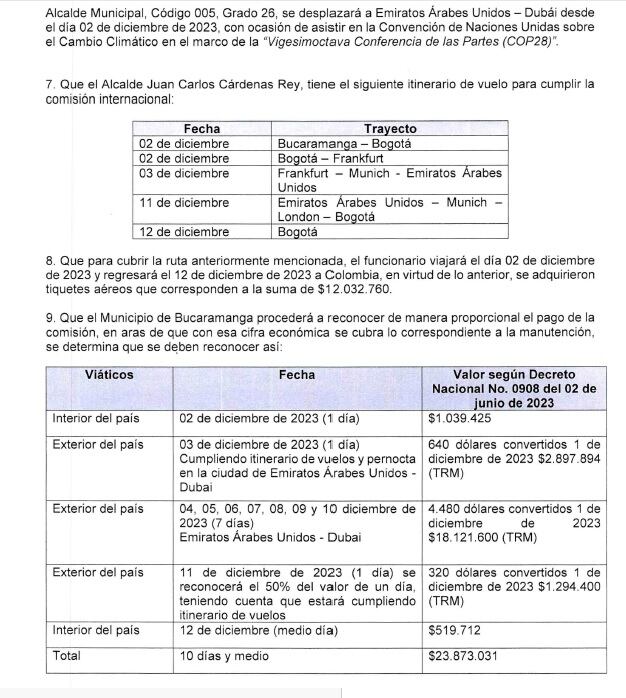 En un segundo artículo le reconocen el pago de viáticos de conformidad con el decreto nacional 0908 del 2 de junio de 2023 y la resolución 0196 del 30 de junio de este año, “el valor de la comisión es $23.873.031. Autorizar al tesorero general del municipio para cancelar la suma total de $35,905.791 al señor alcalde Juan Carlos Cárdenas Rey”, completa el documento.