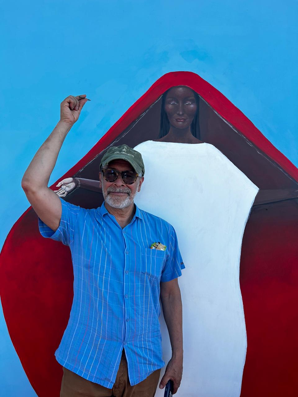 El maestro Pedro Ruiz con su mural.