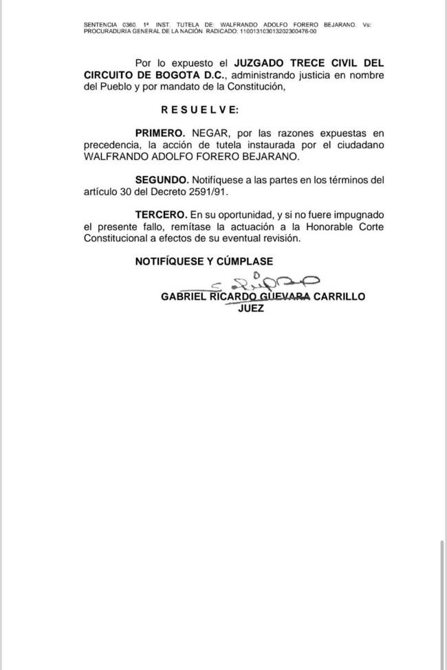 Ahora el juzgado 13 civil del circuito de Bogotá negó la tutela presentada, argumentando que, para acudir a la tutela, Walfrando Forero debe agotar los mecanismos judiciales disponibles, tanto ordinarios como extraordinarios ya que ambos tienen como propósito final lograr la protección adecuada de los derechos de las personas.