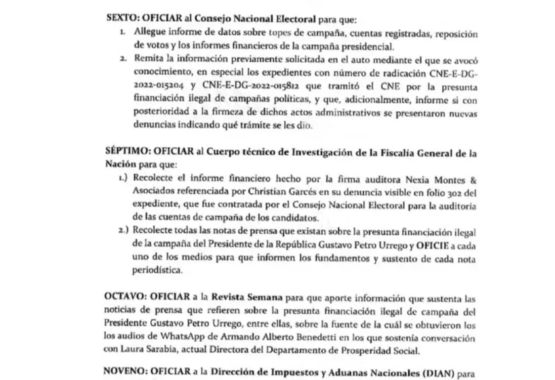 Entre las pruebas que ordenó practicar, aparece en el numeral octavo, oficiar a la Revista Semana para que, “aporte información que sustenta las noticias de prensa… entre ellas sobre la fuente de la cual se obtuvieron los audios de whatsapp de Armando Benedetti, en los que sostenía conversación con Laura Sarabia, actual directora del Departamento de Prosperidad Social.