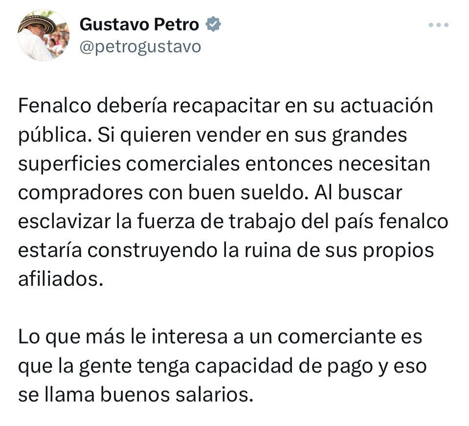 A través de su cuenta de X el mandatario se refirió a las declaraciones de Fenalco aseguro que “Fenalco debería recapacitar en su actuación pública. Si quieren vender en sus grandes superficies comerciales entonces necesitan compradores con buen sueldo. Al buscar esclavizar la fuerza de trabajo del país Fenalco estaría construyendo la ruina de sus propios afiliados”.