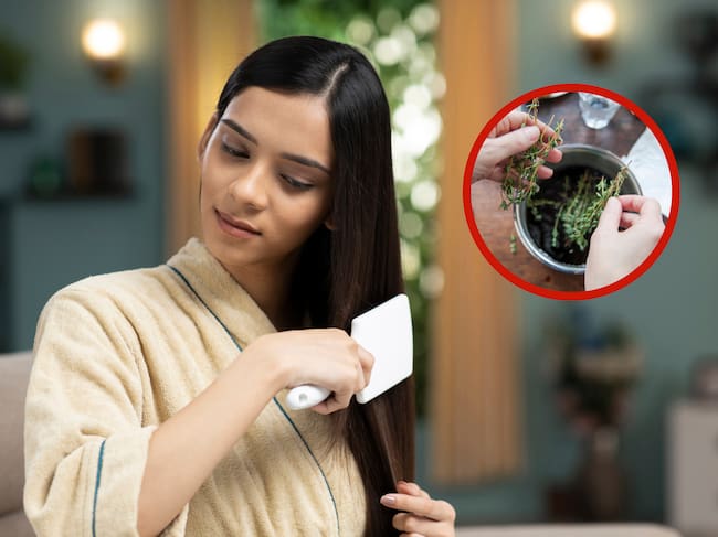 Mujer cepillando su cabello junto a alguien que sostiene tomillo entre sus manos (Getty Images)