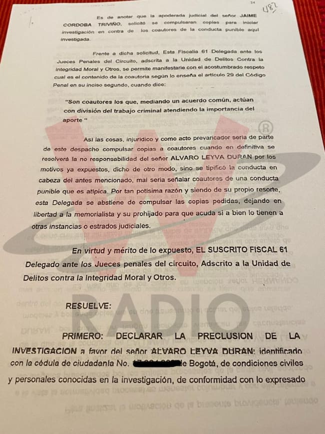 En esos papeles, el ahora subalterno del canciller determina: “Declarar la preclusión de la investigación a favor del señor Álvaro Leyva Durán”.