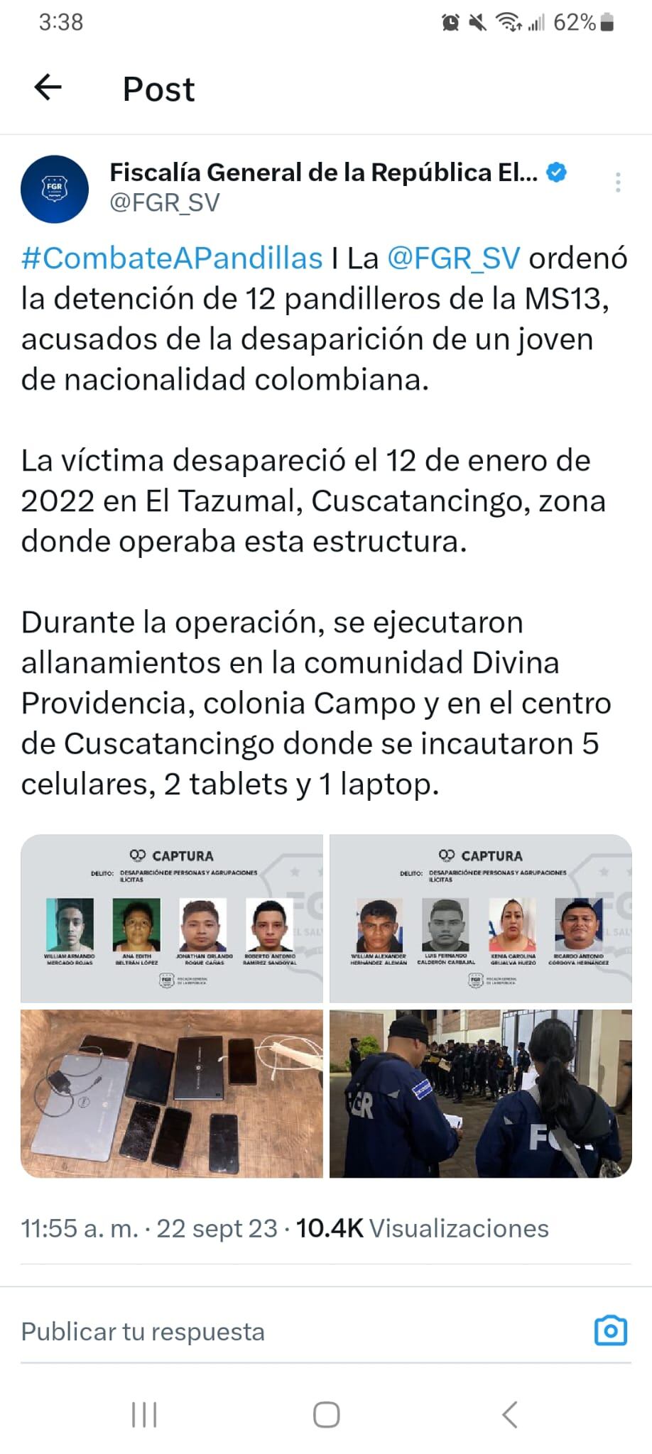 Pantallazo cuenta de la Fiscalía de El Salvador donde hace referencia al asesinato del colombiano. Foto Cortesía Luz Marina Pérez
