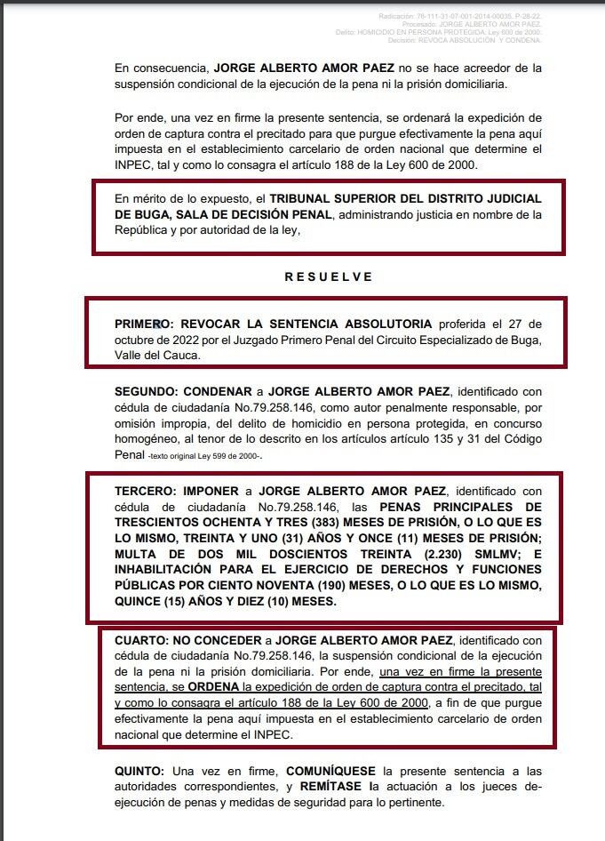 En un fallo de segunda instancia, el Tribunal Superior de Buga tumbó la absolución al coronel en retiro del Ejército Nacional, Jorge Alberto Amor, y lo condenó a 31 años y 11 meses de prisión por la masacre de 24 personas en los corregimientos de Alaska, La Habana y la Magdalena, ocurrida en octubre de 2001 a manos de los paramilitares.