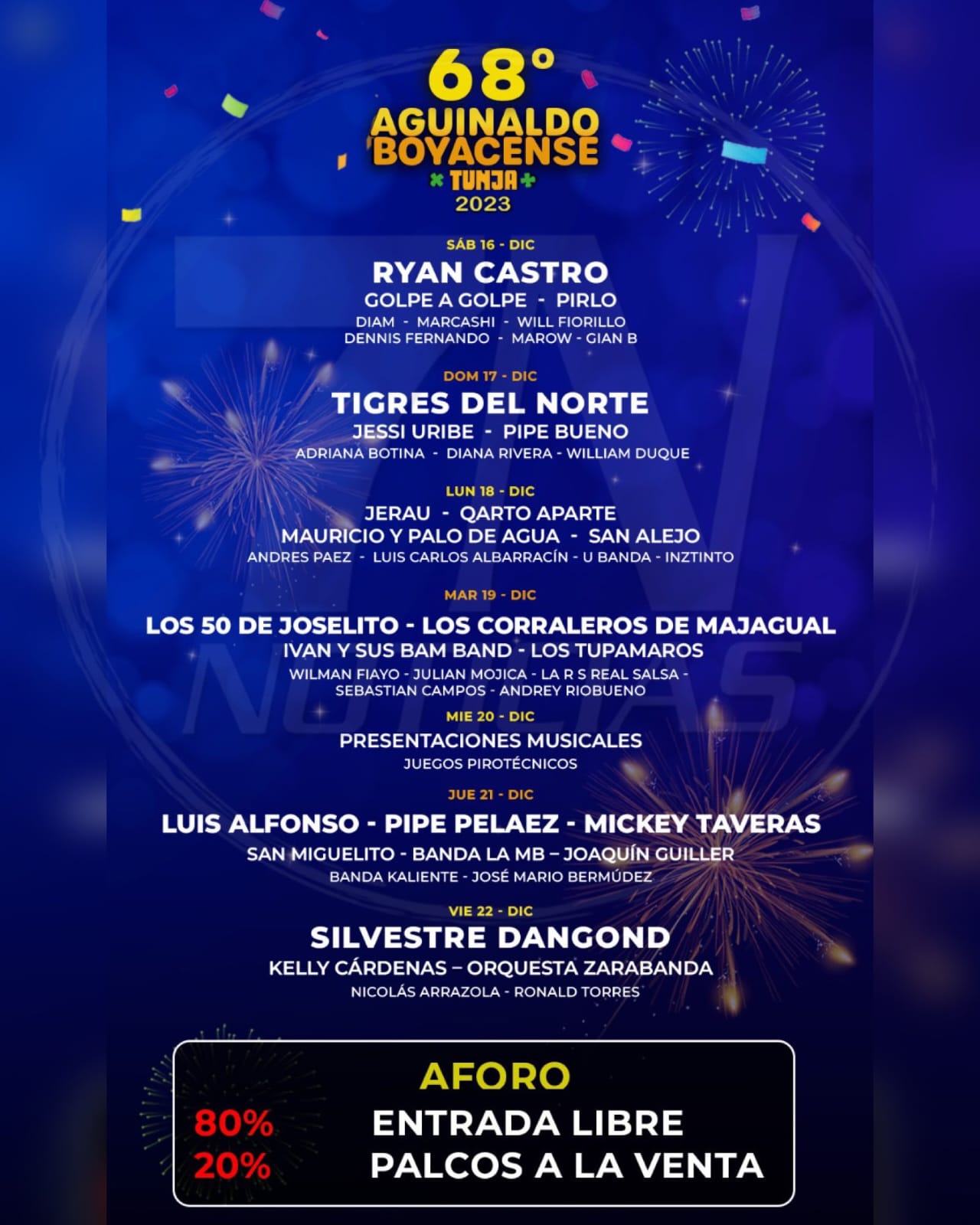 Ryan Castro, Golpe a Golpe y Pirlo se presentarán este sábado 16 de diciembre. El domingo el turno es para los Tigres del Norte, Jessie Uribe y Pipe Bueno. El lunes la fiesta sigue con la presentación de artistas como Jerau y San Alejo. El martes 19 Los 50 de Joselito, Los Corraleros de Majagual, Los Tupamaros y más, tendrán sus presentaciones.