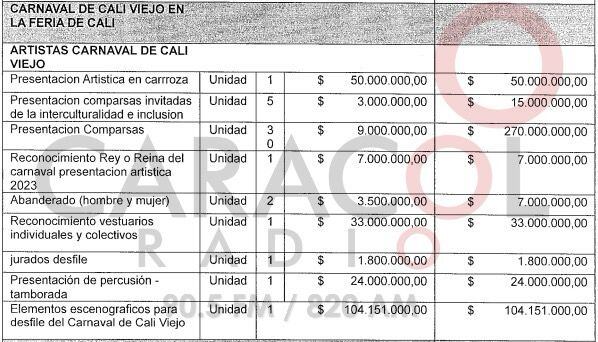 Caracol Radio pudo identificar que en su conjunto, la actividad tendría un costo proyectado de $ 511.951.000, según la invitación realizada por la secretaría de Cultura a Corfecali donde se especifican los rubros que deben ser destinados para la realización de cada uno de los espacios.