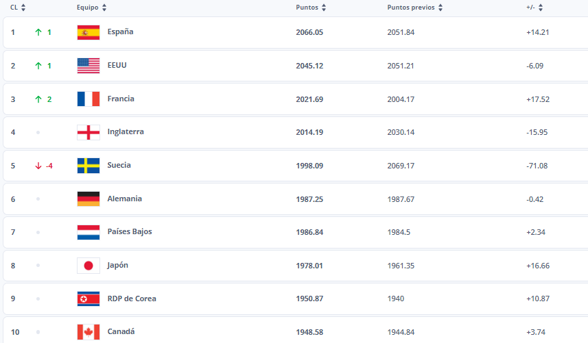 Si bien el seleccionado que dirige Ángelo Marsiglia pasó de 1743.8 a 1746.25 puntos, una diferencia de +2.72 unidades, perdió un puesto y ahora se ubica en la vigesimotercera (23) casilla. Estados Unidos, con 2045.12, se encuentra en el segundo puesto, mientras que Francia cierra el podio con 2045.12. Inglaterra, Suiza, Alemania, Países Bajos, Japón, Corea y Canadá completan el Top 10.