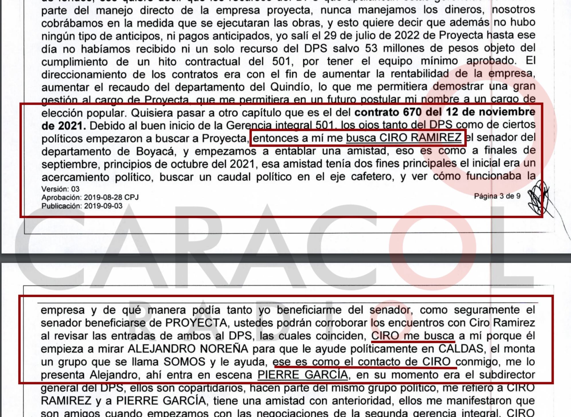 En otro interrogatorio, el exgerente de Proyecta Quindío, declaró ante la Fiscalía que el senador Ciro Ramírez lo buscó a finales de septiembre, principios de octubre 2021 con dos fines principales: Primero, un cercamiento político, buscar caudal político en el eje cafetero y segundo, ver cómo funcionaba la empresa y de qué manera podían beneficiarse.