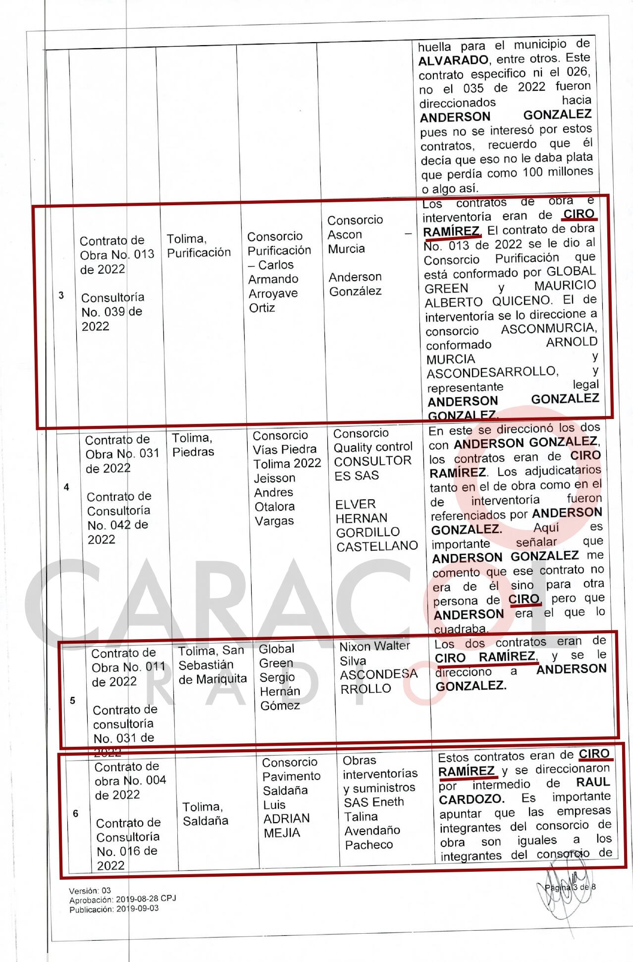 El interrogatorio más reciente data del 1 de agosto de 2023. En esa diligencia, Ese testigo le ratificó a la Fiscalía que los contratos de obra y de interventoría que se hicieron en Tolima y Quindío se direccionaban por orden de Ciro Ramírez. ((VER DOCUMENTO))