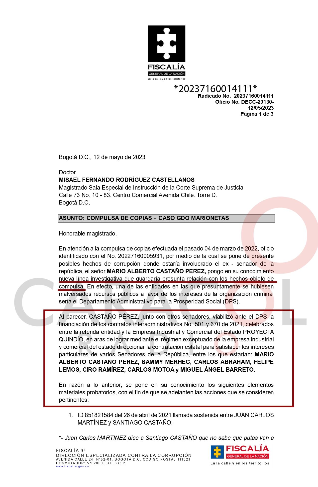 Todo se originó tras una compulsa de copias que hizo la Fiscalía a la Corte, el 12 de mayo de 2023. En ese documento se puso de presente una nueva línea de investigación que surgió del expediente del condenado y fallecido exsenador Mario Castaño, en un caso de corrupción que se conoció como “Marionetas”.