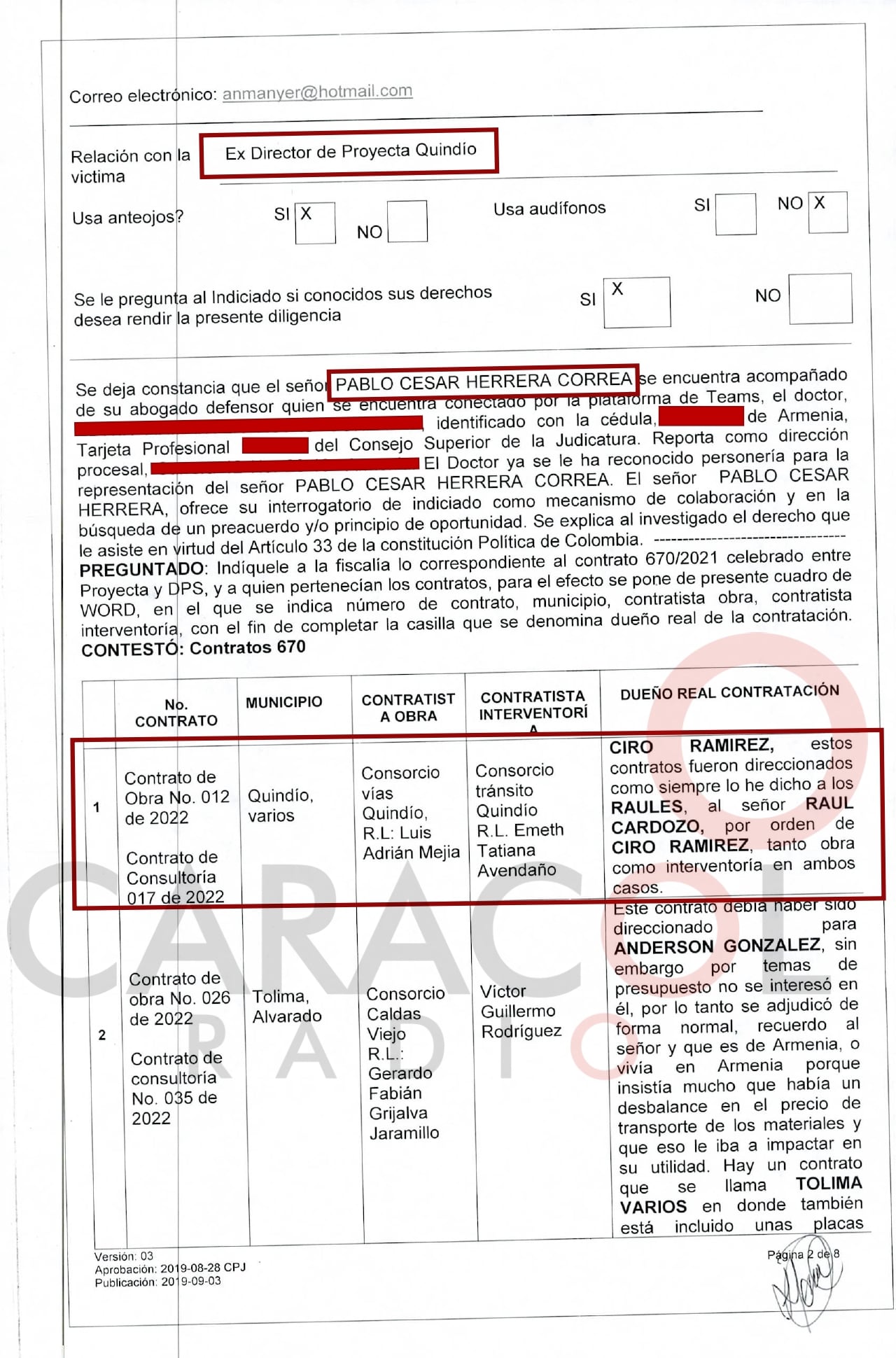 Caracol Radio tiene en su poder los seis interrogatorios que rindió ante la Fiscalía y que se remitieron a la Corte, del exgerente de Proyecta Quindío, Pablo César Herrera Correa, quien era la ficha de Mario Castaño y hoy es testigo principal de la Fiscalía, él aspira a un principio de oportunidad por su colaboración y gracias a su testimonio se originó la investigación en la Corte contra el senador Ciro Ramírez, y otros congresistas.