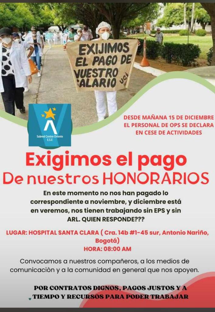 En redes sociales se compartieron videos de los trabajadores a las afueras del Hospital Santa Clara, ubicado en la carrera 14b #1-45 sur, en la localidad de Antonio Nariño. Los trabajadores de la Subred Centro Oriente aseguraron que no les han hecho el pago de nómina de noviembre ni diciembre.