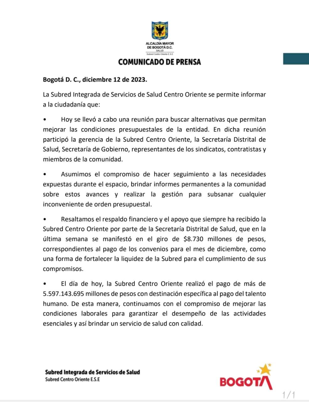 Ante los reclamos de los empleados, la Alcaldía Mayor de Bogotá emitió un comunicado de prensa el pasado 12 de diciembre en el que aseguraron que sostuvieron una reunión para buscar alternativas que les permitan mejorar las condiciones presupuestales de la entidad.