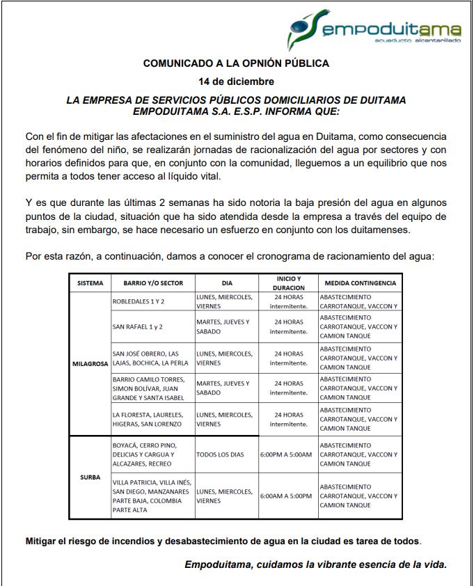 “En el municipio de Duitama llevamos aproximadamente diez días en los cuales tenemos una baja muy significativa de los caudales del río Surba, que es nuestra principal fuente de abastecimiento y hemos tenido dificultades en la prestación del servicio de acueducto en algunos barrios. Es por esto que desde ahora nos vemos en la necesidad de empezar a realizar algunas reducciones y algunos racionamientos en varias partes de la ciudad, particularmente en los que pertenecen al subsistema de La Milagrosa como en barrios como Robledales 1 y 2, San Rafael 1 y 2, San José Obrero, las Lajas, Bochica, La Perla, Camilo Torres, Simón Bolívar, Juan Grande, Santa Isabel, La Floresta, Laureles, Higueras, San Lorenzo. Para algunos barrios que dependen del subsistema del Surba vamos a tener también otro tipo de racionamientos diferentes. Para el caso de los barrios Boyacá, Cerro Pino, Delicias, Cargua, Alcázares y El Recreo el racionamiento va a ser todos los días de 6:00 de la tarde a 5:00 de la mañana”, aseguró Edison Pérez, gerente (e) de Empoduitama.