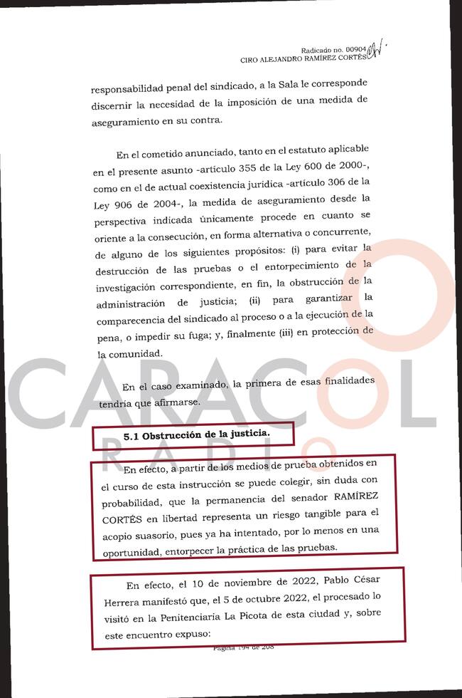 La Sala de Instrucción de la Corte Suprema ordenó la captura del senador Ciro Ramírez, porque considera que puede obstruir la justicia y entorpecer la recopilación de pruebas en el proceso que se adelanta en su contra. La visita del senador al testigo clave del caso de corrupción “Marionetas” en La Picota, fue uno de los argumentos más poderosos para mantenerlo en prisión.