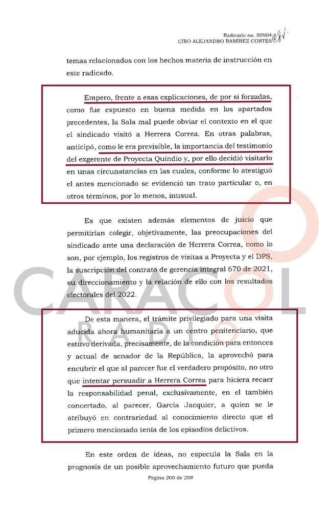 “De esta manera, el trámite privilegiado para una visita aducida ahora como humanitaria a un centro penitenciario, que estuvo derivada, precisamente, de la condición para entonces y actual senador de la República, la aprovechó para encubrir el que al parecer fue su verdadero propósito, no otro que intentar persuadir a Herrera Correa para que hiciera recaer la responsabilidad penal, exclusivamente, en el también concertado, al parecer, García Jaquier, a quien se le atribuyó en contrariedad al conocimiento directo que el primero mencionado tenía de los episodios delictivos”, se lee en el auto de la Corte Suprema.
