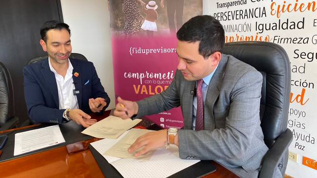 Jhon Mauricio Marín, presidente de Fiduprevisora, y Mauricio Toro, presidente de Icetex, durante la firma del memorando de entendimiento entre las dos entidades. | Foto: Cortesía
