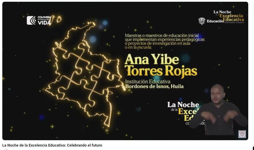 Por su parte, la docente galardonada Ana Yibe Torres Rojas, expresó que este merecimiento se debe al mérito de trabajo en equipo en la Institución Educativa Bordones para disminuir la mortandad de abejas en la agricultura, especialmente en la producción de panela en el municipio de Isnos.