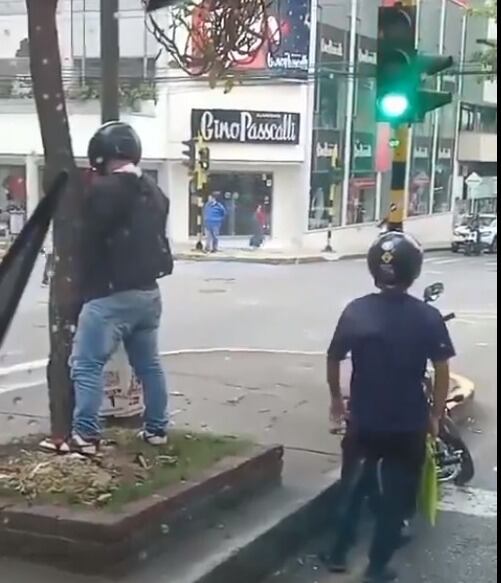 En el vídeo se ve cómo el conductor de una motocicleta la deja mal estacionada en un semáforo para bajarse a orinar en uno de los árboles del separador de la vía.
