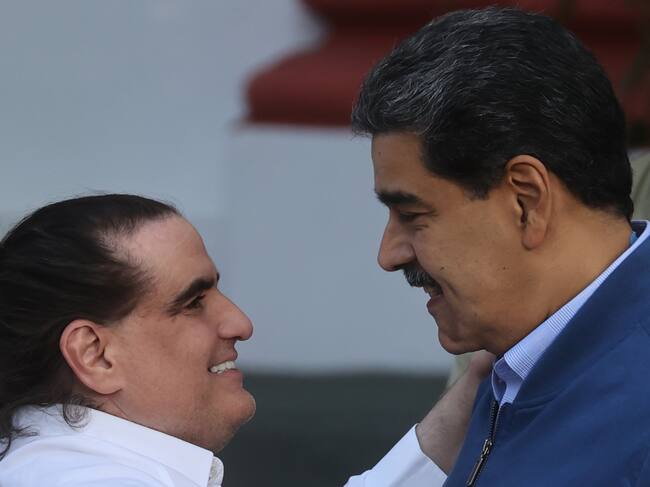 AME5413. CARACAS (VENEZUELA), 20/12/2023.- El mandatario de Venezuela Nicolás Maduro (d) saluda al empresario colombiano Alex Saab hoy, en el Palacio de Miraflores en Caracas (Venezuela). EFE/ Miguel Gutiérrez / Miguel Gutierrez (EFE)