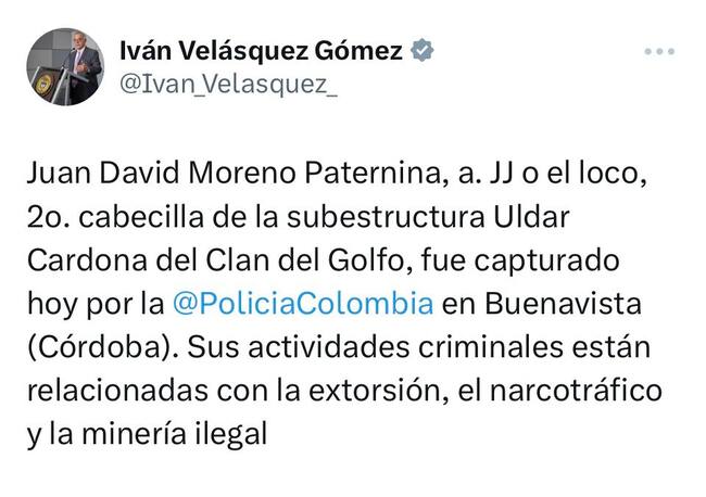 El ministro de defensa, Iván Velásquez a través de su cuenta de X anunció que fue capturado el segundo cabecilla de la subestructura Uldar Cardona del Clan del Golfo, se trata de Juan David Moreno Paternina, ‘El Loco’.