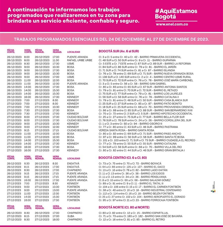 ENEL Colombia, empresa encargada de prestar los servicios de energía eléctrica en Bogotá, informó que adelantará labores técnicas en distintos sitios de la ciudad durante la última semana del año.