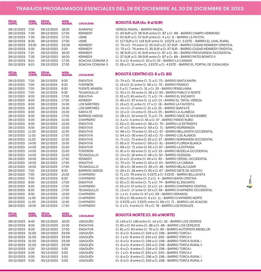 Por esa razón, entre el 26 y el 30 de diciembre de 2023 efectuarán cortes en el servicio en distintas localidades de la ciudad.