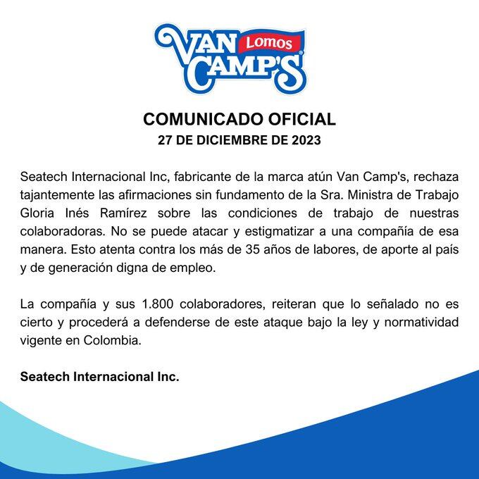 Comunicado de Van Camp's rechazando las declaraciones de la ministra de Trabajo.