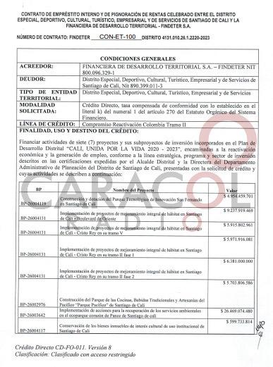 Según el documento publicado en la plataforma de contratación estatal Secop, la obligación contraída por el distrito estaría destinada al financiamiento de diferentes proyectos adelantados en el último período. Los recursos se dividirían de la siguiente manera: