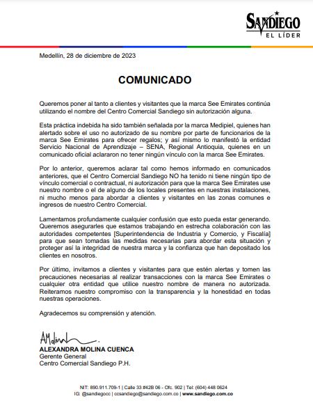 “Queremos aclarar tal como hemos informado en comunicados anteriores, que el Centro Comercial Sandiego NO ha tenido ni tiene ningún tipo de vínculo comercial o contractual, ni autorización para que la marca See Emirates use nuestro nombre o el de alguno de los locales presentes en nuestras instalaciones, ni mucho menos para abordar a clientes y visitantes en las zonas comunes e ingresos de nuestro Centro Comercial.”, Comunicado Centro Comercial Sandiego.