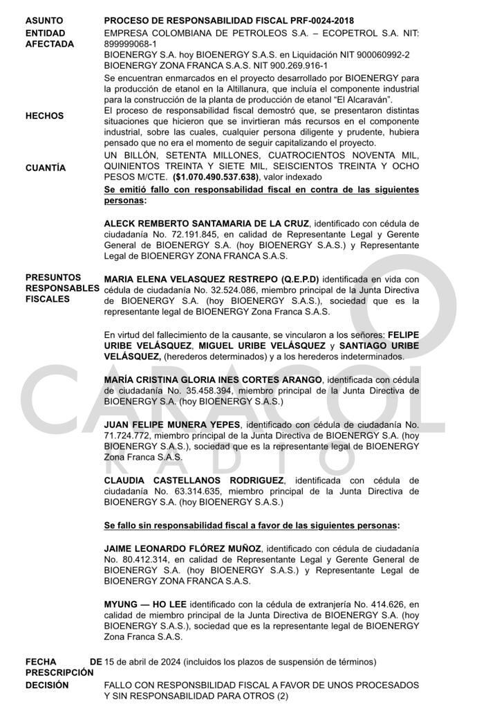 Caracol Radio conoció en primicia unos documentos que hablan de la responsabilidad fiscal por el caso Bioenergy. En estos se aclara que la responsabilidad compromete 1.070 billones de pesos. Además, se señala que los integrantes de la junta directiva del proyecto tendrán que responder con su patrimonio.