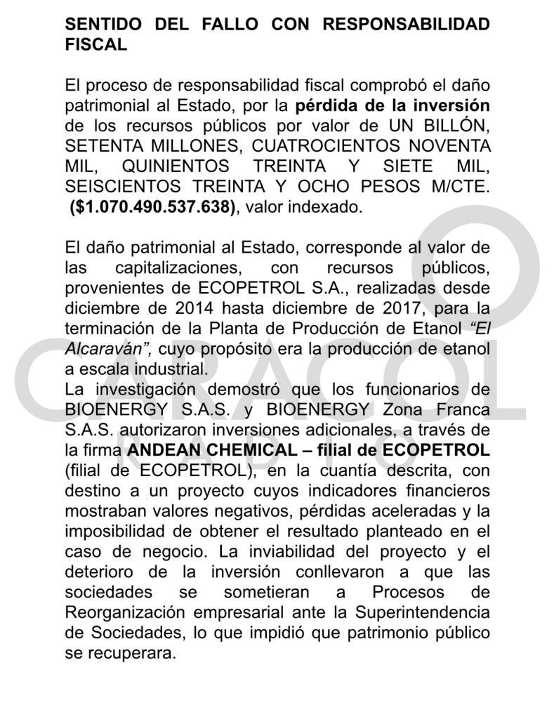 Por otra parte, en el documento se aclara que el daño patrimonial al Estado se debe al valor de las “capitalizaciones con recursos públicos provenientes de ECOPETROL S.A., realizadas desde diciembre de 2014 hasta diciembre de 2017. Además, tendrían relación con la terminación de la Planta de Producción de Etanol ‘E/Alcaraván’. Este proyecto buscaba la producción de etanol a escala industrial.