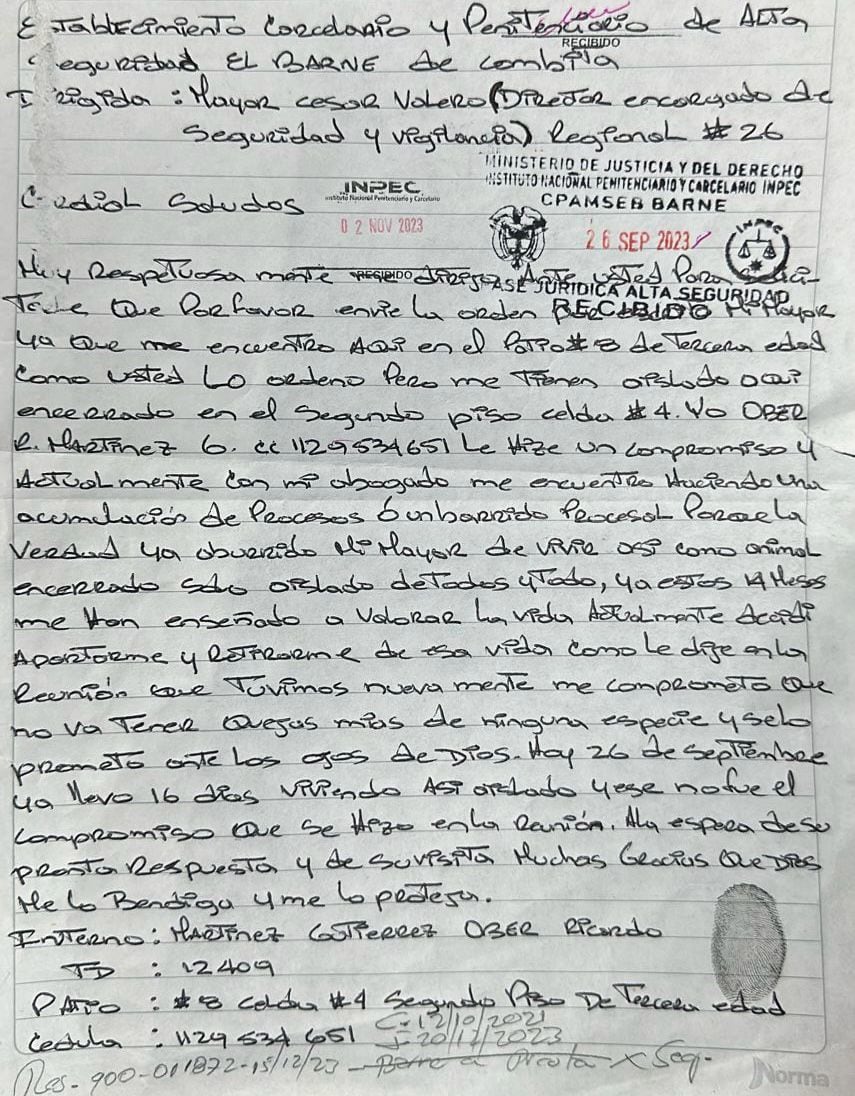 La carta de 'El Negro Ober' al INPEC