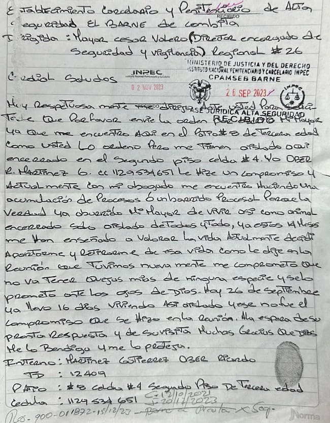 Se conoció una carta de alias ‘El Negro Ober’, el jefe de la banda ‘Los Rastrojos’ en la que ruega al INPEC que le bajen los estrictos controles de custodia, y a cambio, se compromete a dejar de delinquir desde prisión.