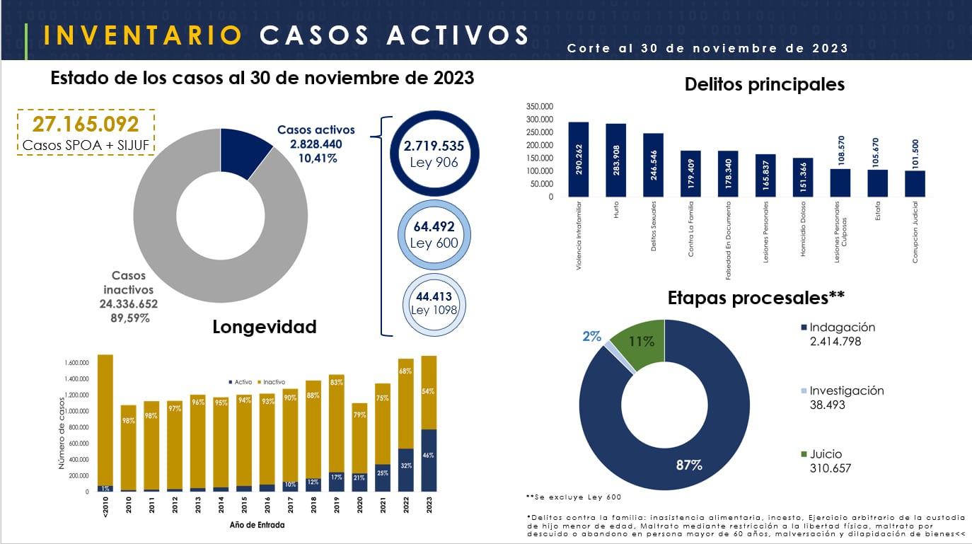 El informe de la Fiscalía dice que, a corte del 30 de noviembre de 2023, hay un registro de 2′828.440 casos activos.
