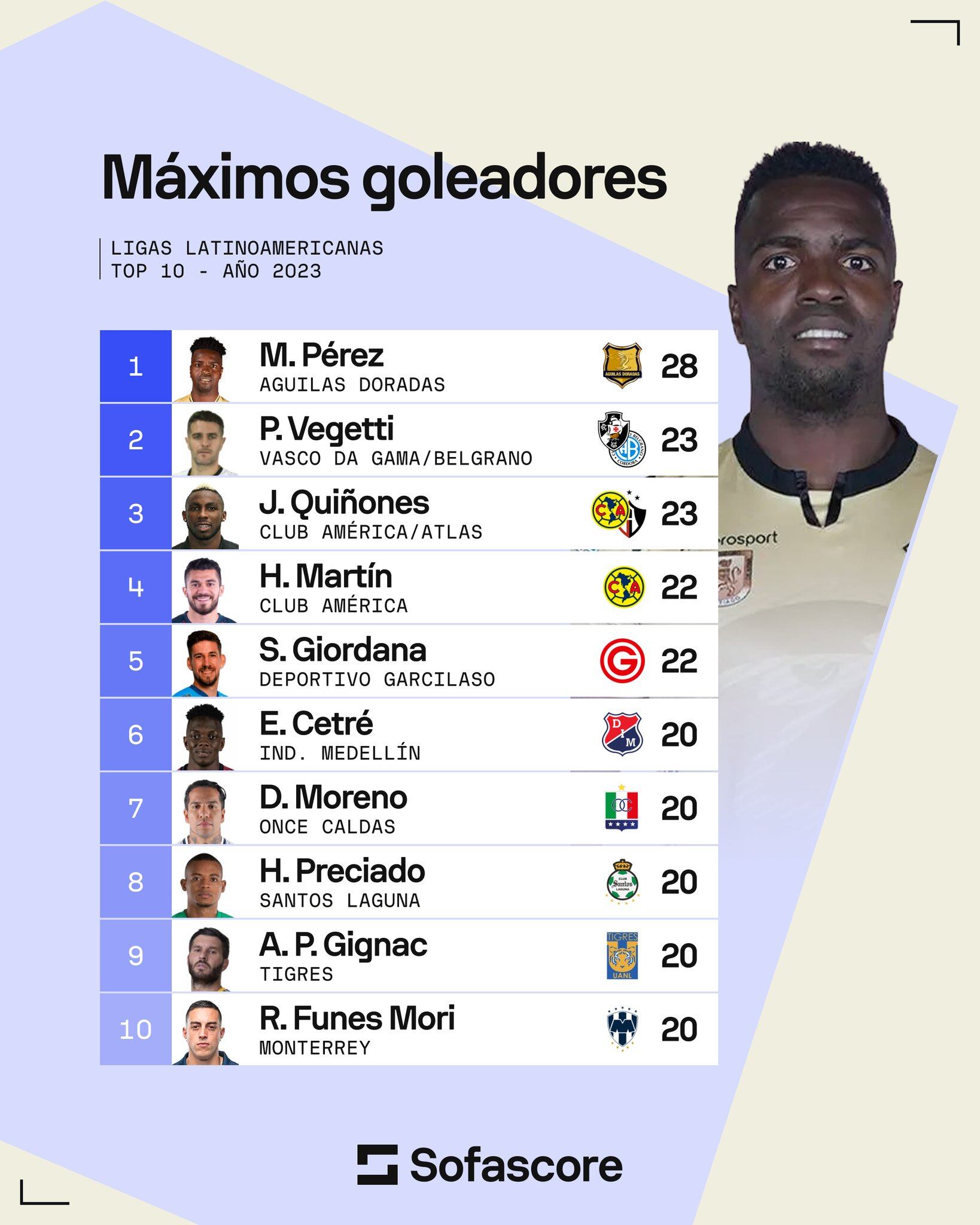 El portal Sofa Score Latinoamerica elaboró un Top 10 de los principales goleadores del fútbol latinoamericano en la temporada, teniendo como referencia ocho Ligas: Argentina, Brasil, México, Colombia, Uruguay, Perú, Ecuador y Chile.