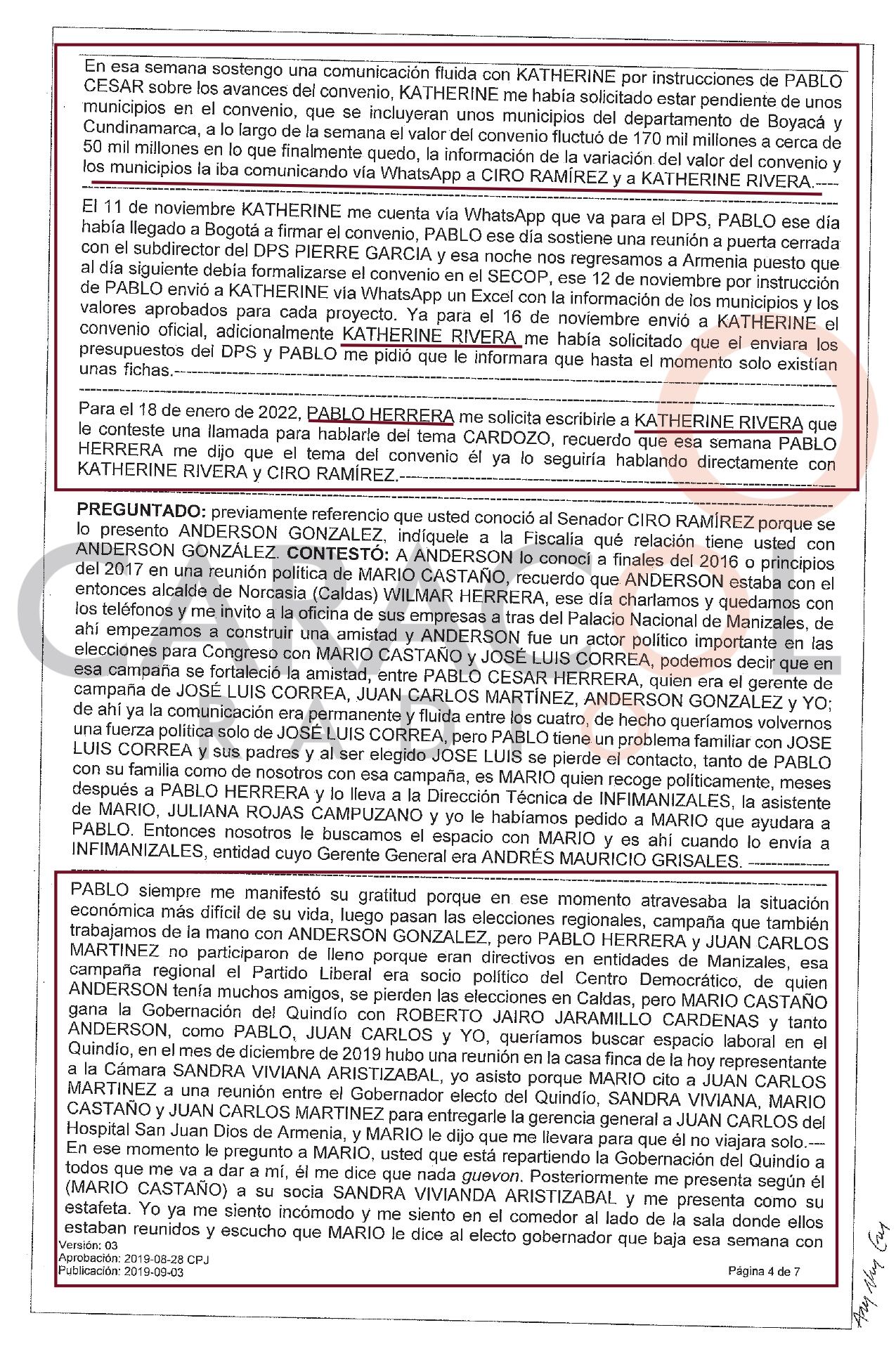 Sobre el senador Ciro Ramírez, dijo que lo conoció a finales de septiembre de 2021, en el Club Manizales sede del Cable por intermedio de Anderson González, otro contratista y lobista político.