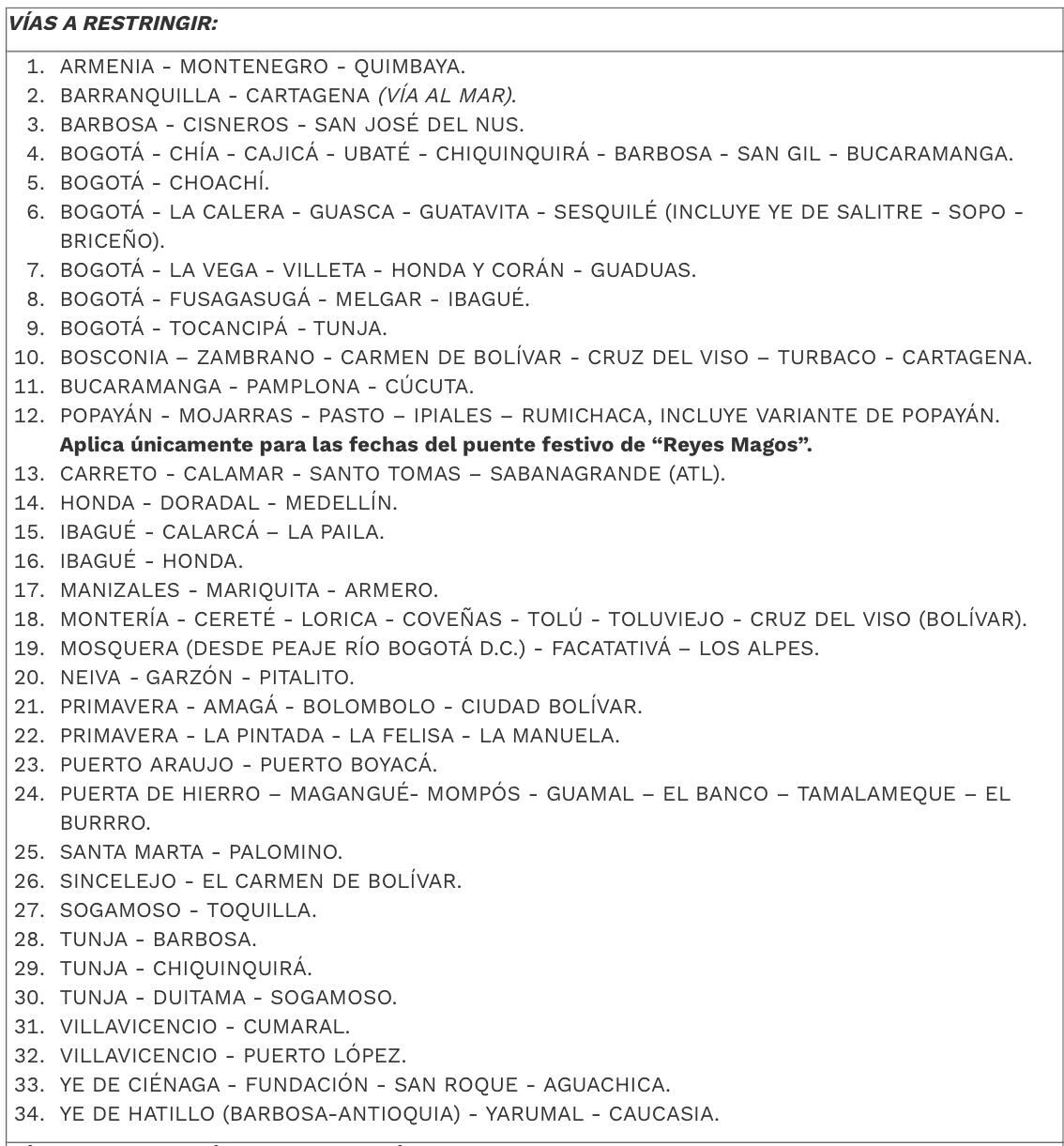 Para cerrar, el lunes festivo se presentarán restricciones en las vías anteriormente mencionadas, en ambos sentidos, desde las 10:00 a.m. hasta las 11:00 p.m, y en otros 34 corredores viales  de las 08:00 de la mañana a 01:00 de la mañana del 9 de enero.